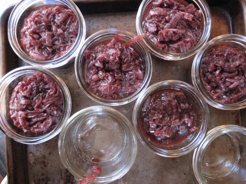 The bulk of my canning is done in summer.  I spend days (and more often nights- after the kids have gone to bed) sweating over the canning pot every August and September.  There is a fever that drives my need to put food up.  Though by the end of the season, I vow off the jars.  My shelf is full and I have to force myself to turn my back on any more abundance that threatens to inspire me.  Luckily, with a break of a few months, I am ready to can again.  Many jars, once full, are ready to be refilled. In winter, I break out my pot, jars, and lids and make Caramelized Onion Relish.