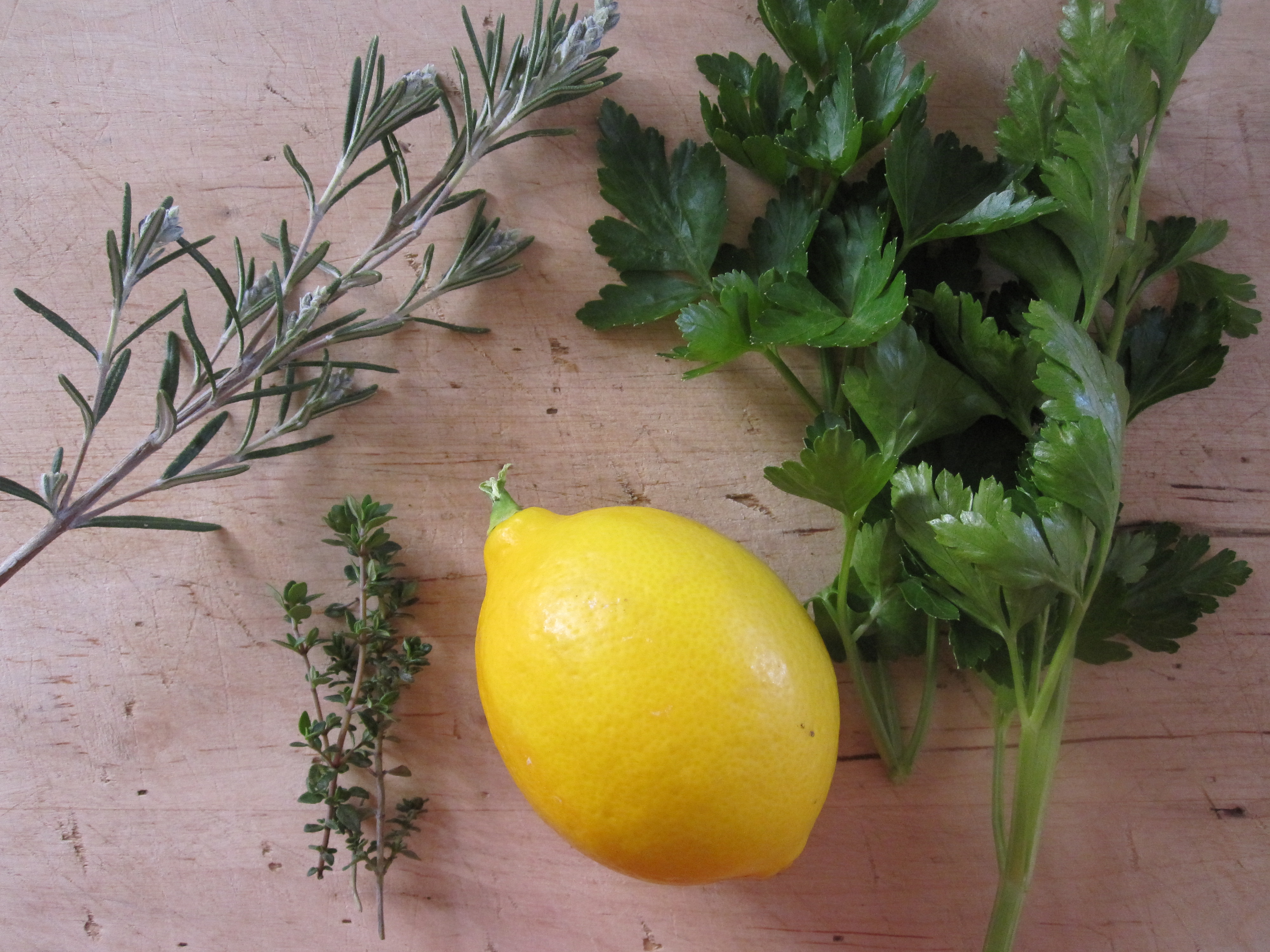 Using fresh herbs for this recipe is crucial. Fortunately, I live in a climate where my garden provides fresh herbs year round. The following recipe is more of an idea and guideline than a recipe to strictly follow. The precise mixture of the herbs is not crucial, but I like half of the herb volume to be parsley and the other half to be more intense herbs like thyme, rosemary, oregano, and the lemon zest.