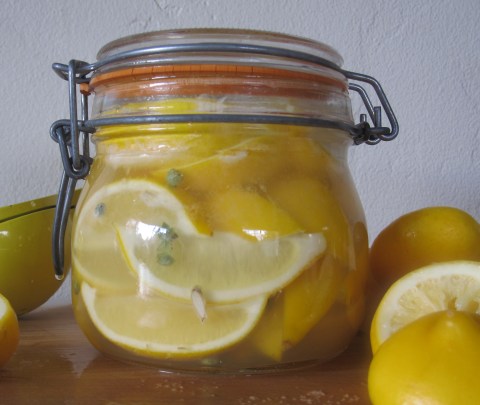 This recipe comes from my grandmother’s recipe file. She, like me, sought out ways to celebrate each harvest and make it last. The first time I made these, I had no idea what to do with them. Luckily, they last a ridiculously long time in the refrigerator, so I had plenty of time to accumulate recipes. (After a year in the fridge, they still tasted fine, but I tossed them because it just seemed wrong to be eating something so old.) They are used often in North African and Middle Eastern foods. They can be added to dishes whole or you can remove the pulp and pith and add the preserved zest.
