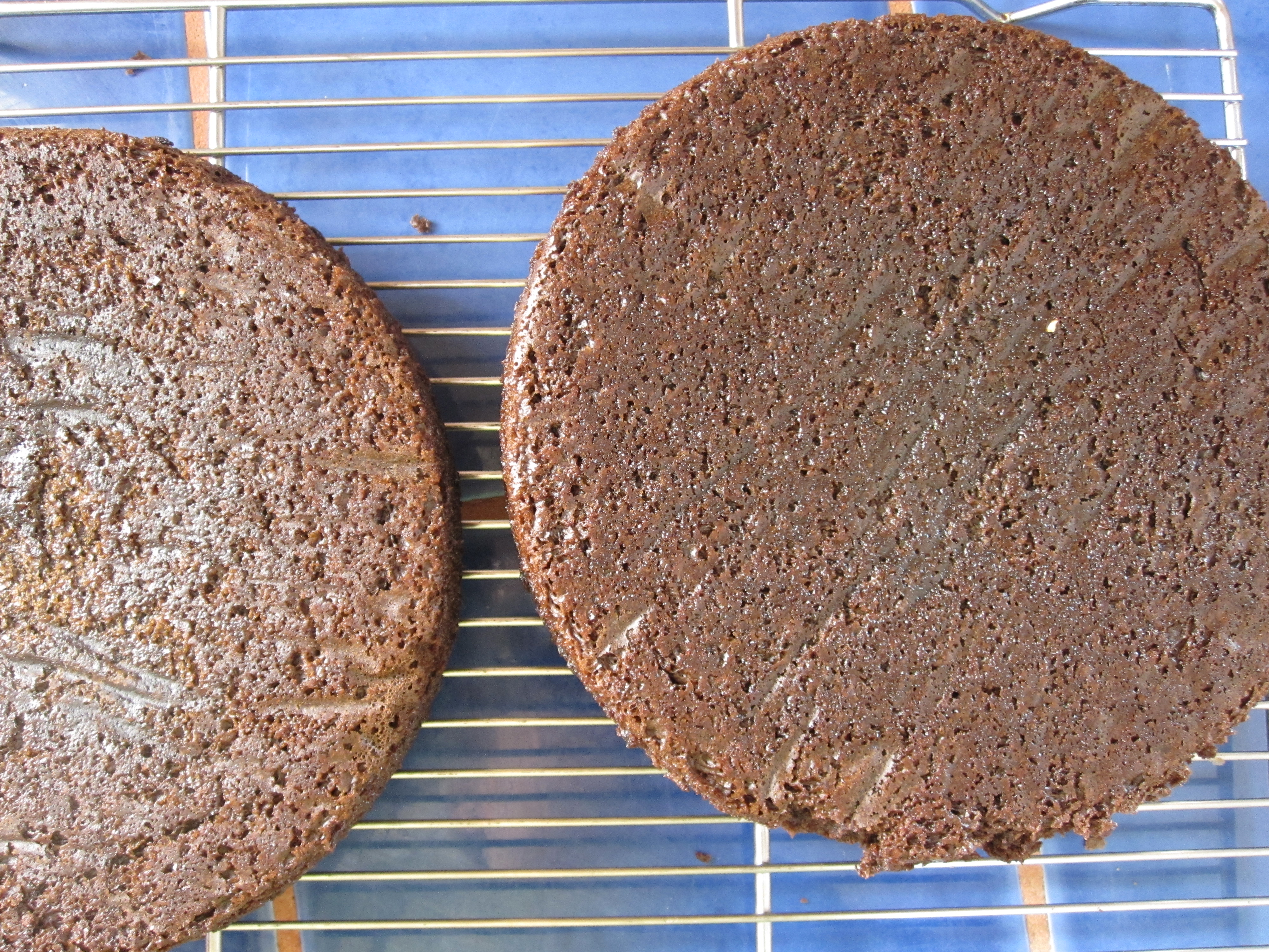 Pour batter evenly into the 2 prepared pans.  Slide pans in the oven and bake for 35-40 minutes, until a toothpick inserted into the center comes out clean.  Place pans on a cooling rack and let sit for 10 minutes.  Slide a knife around the inside edge of each pan to loosen the cake, then invert onto the cooling racks.  Peel the parchment off the bottom.  Let cakes cool completely before frosting.