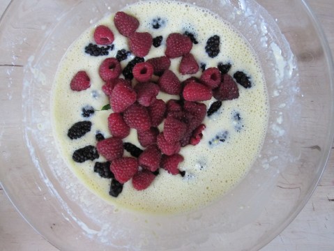 Whisk together eggs and salt. Add the flour and milk and whisk until completely smooth. Gently stir berries in the batter.