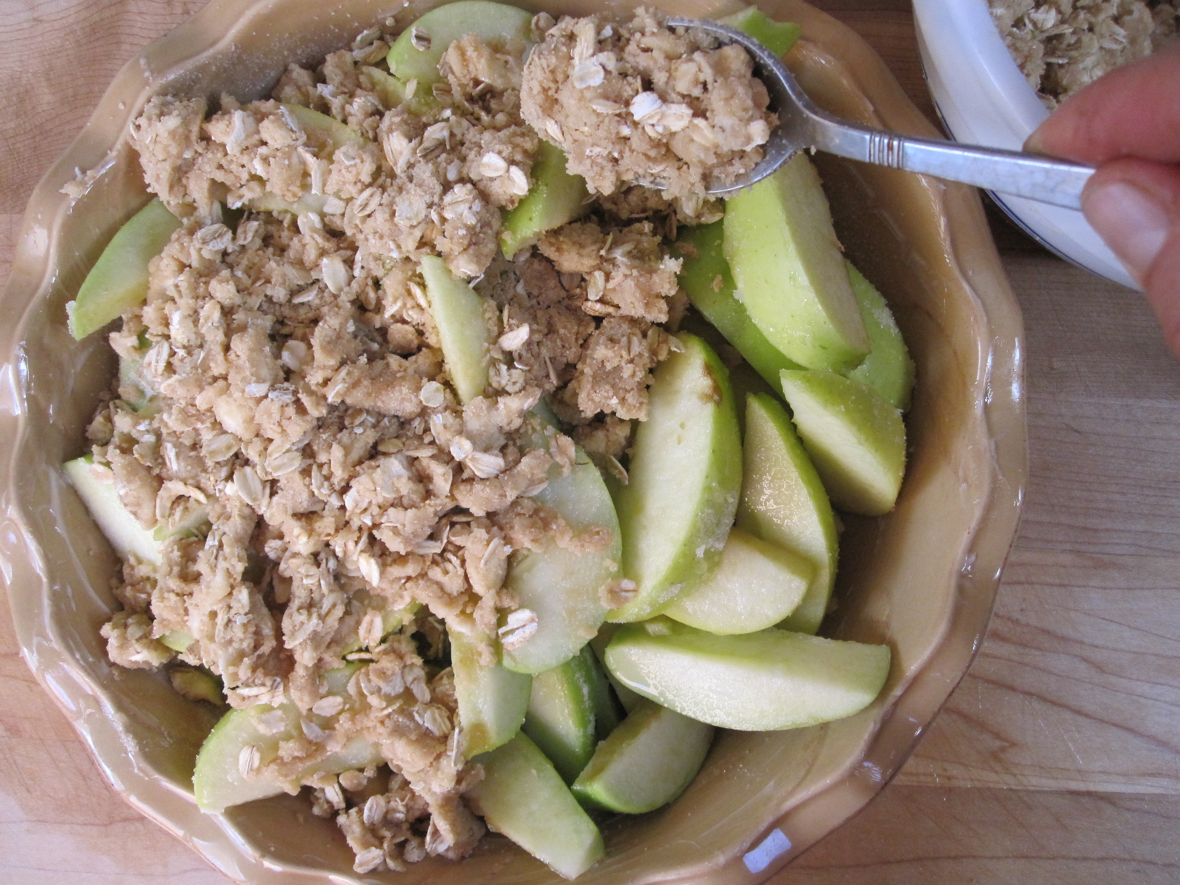 In a separate bowl, combine the brown sugar, flour, cinnamon, and salt. Cut the butter into 1/2 inch cubes, then toss it in the flour and sugar mixture. Using a pastry cutter or your hands, work the butter into the flour and sugar until the butter is mostly incorporated, but there are still some pea-sized pieces. Add the oats and toss to mix thoroughly. Spread the flour and butter mixture over the top of the apples.