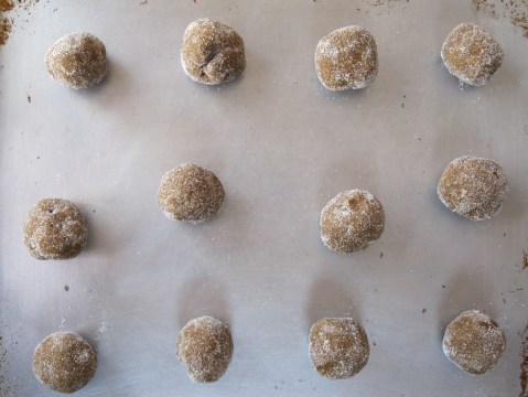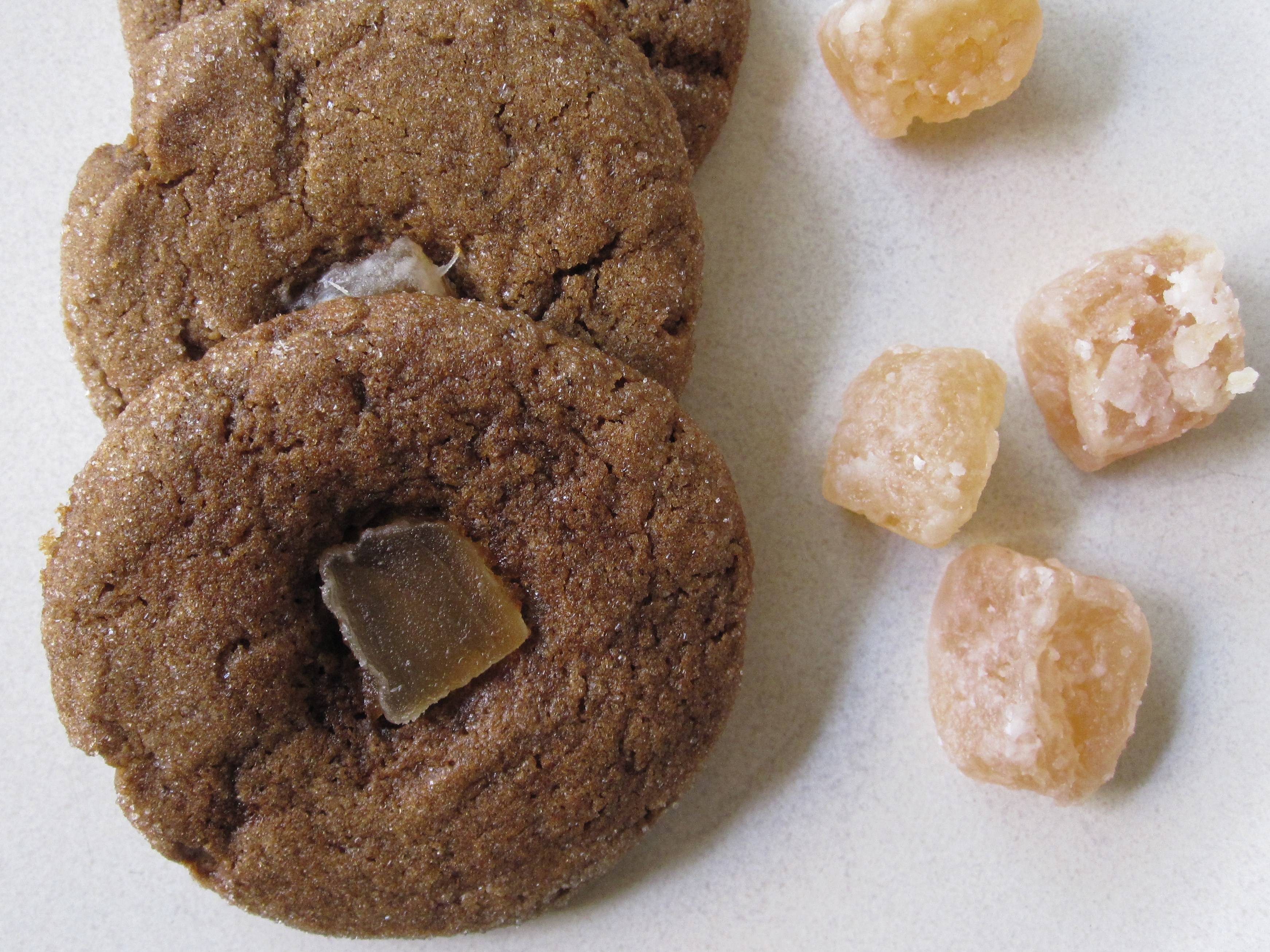 Scoop out roughly 1 1/2 tablespoon pieces of dough and roll between your palms to make even spheres.  Roll each ball in a dish of granulated white sugar.  Place dough balls on an ungreased baking sheet.  Use a wide-bottomed drinking glass to press dough balls down into flat circles.  Press a slice of crystallized ginger gently into the center of each cookie.