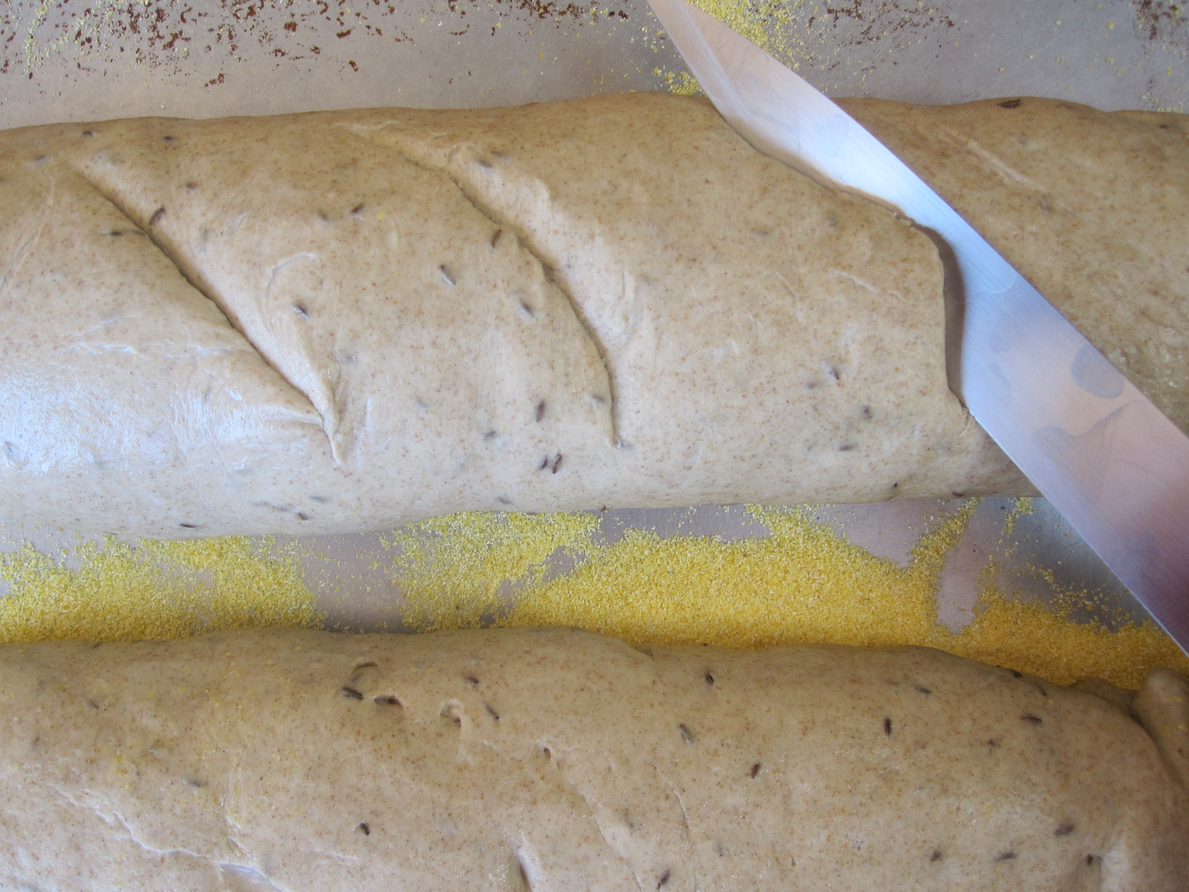 Divide dough into 2 even portions.  Press one dough ball into an 9 x 7 inch rectangle.  Roll along the long side to form a log.  Pinch off the seam to seal. Place on a baking sheet sprinkled with cornmeal, seam down.  Repeat with the other portion of dough.  Cover loosely with a floured towel or plastic wrap.  Allow to rise 1 to 1/2 hours until dough looks bloated and starts to spread.