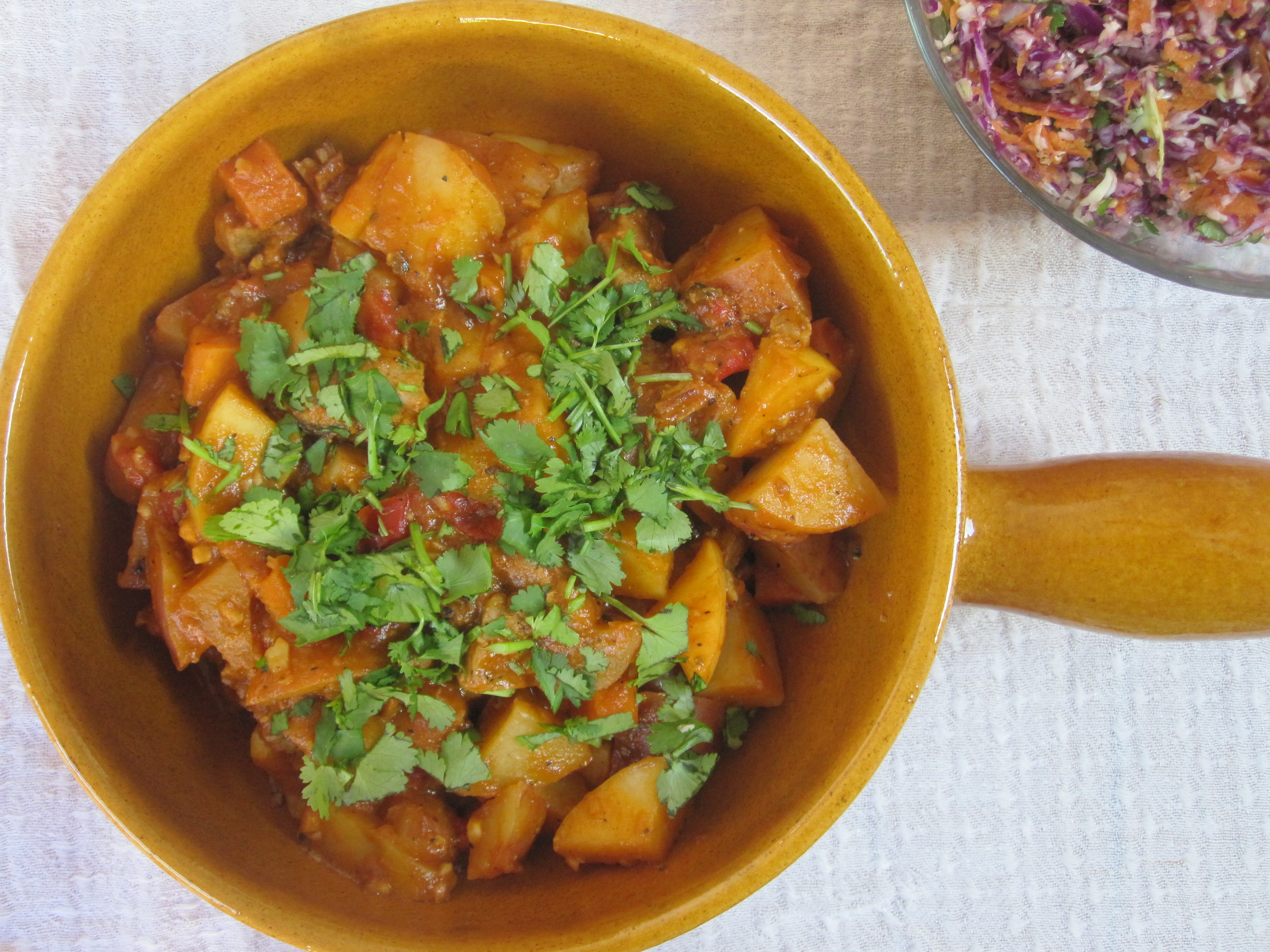 Spring may not be the typical season for stews, but they are comforting and sometimes we need a little comfort even when the sun is shining and the nights are warm. On one such pleasant evening, my family gathered around our garden table to enjoy this stew.  The recipe comes from 660 Curries, by Raghavan Iyer, that a friend generously gave to me as a thank you gift. Choosing from over 600 curries is a bit of a challenge.  This one stood out because it is composed of ingredients I generally have in stock (and perhaps you do too): potatoes, apples, carrots.  I also happened to have a leftover grilled pork tenderloin on hand, but the recipe below calls for uncooked pork.  Either works well.