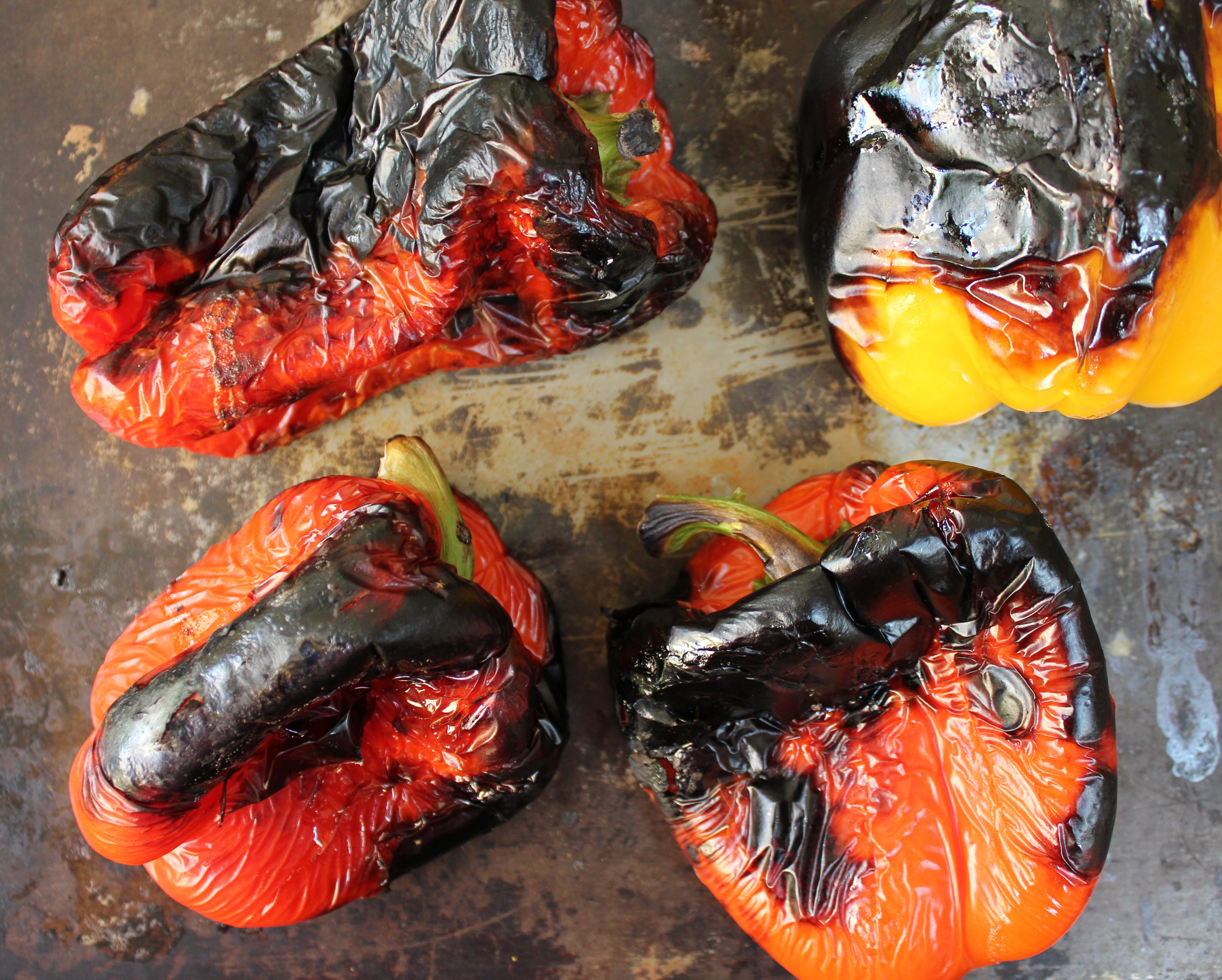 To char the peppers and garlic, they must be exposed to flame or high heat.  This can be done on a barbecue grill over high heat, directly on the gas flame of a stove-top, or under an oven broiler.  I used the broiler to make this batch.  As one side of the peppers blacken, turn them until each side is black.  Once peppers are blackened all over, place them all in a large bowl with a plate or baking tray on top for 10 minutes or so. Set the garlic clove aside.   The peppers will steam a bit, which makes is much easier to remove the skins.  This can also be done in a paper bag with the top rolled down.