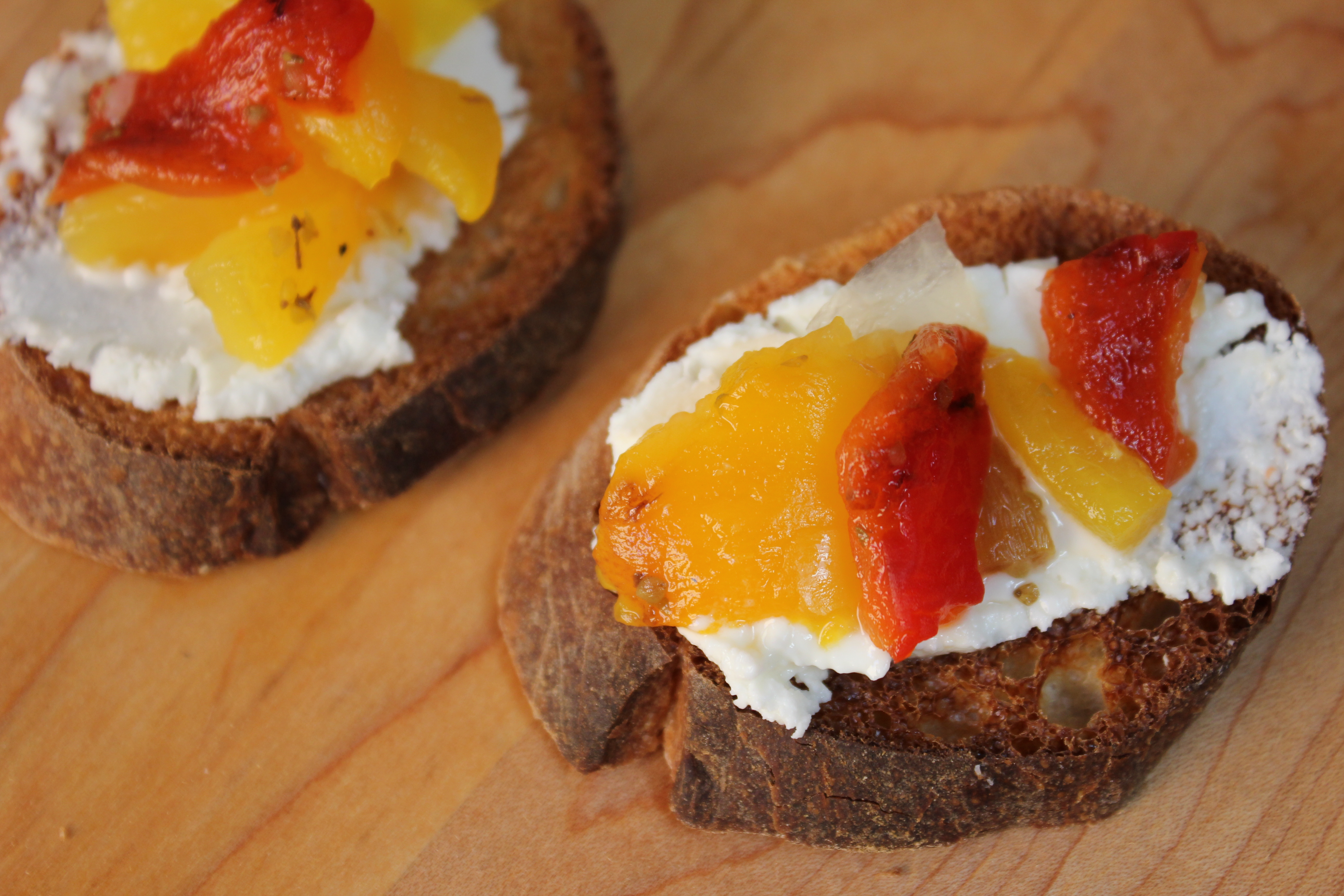 The newest addition to the pantry are jars of these beautiful Char-Roasted Pickled Peppers.  The peppers that are springing up that the markets these days are simply fantastic.  Last year I roasted, sliced, and froze a bunch of peppers, which turned out great on pizzas, but this year I wanted something a bit more sophisticated.  Something that would taste special right out of the jar.  This recipe, from The Complete Book of Small-Batch Preserving is just that.  I already enjoyed these beauties on crostini smeared with chevre, but the uses are truly endless.  How would you eat these peppers?