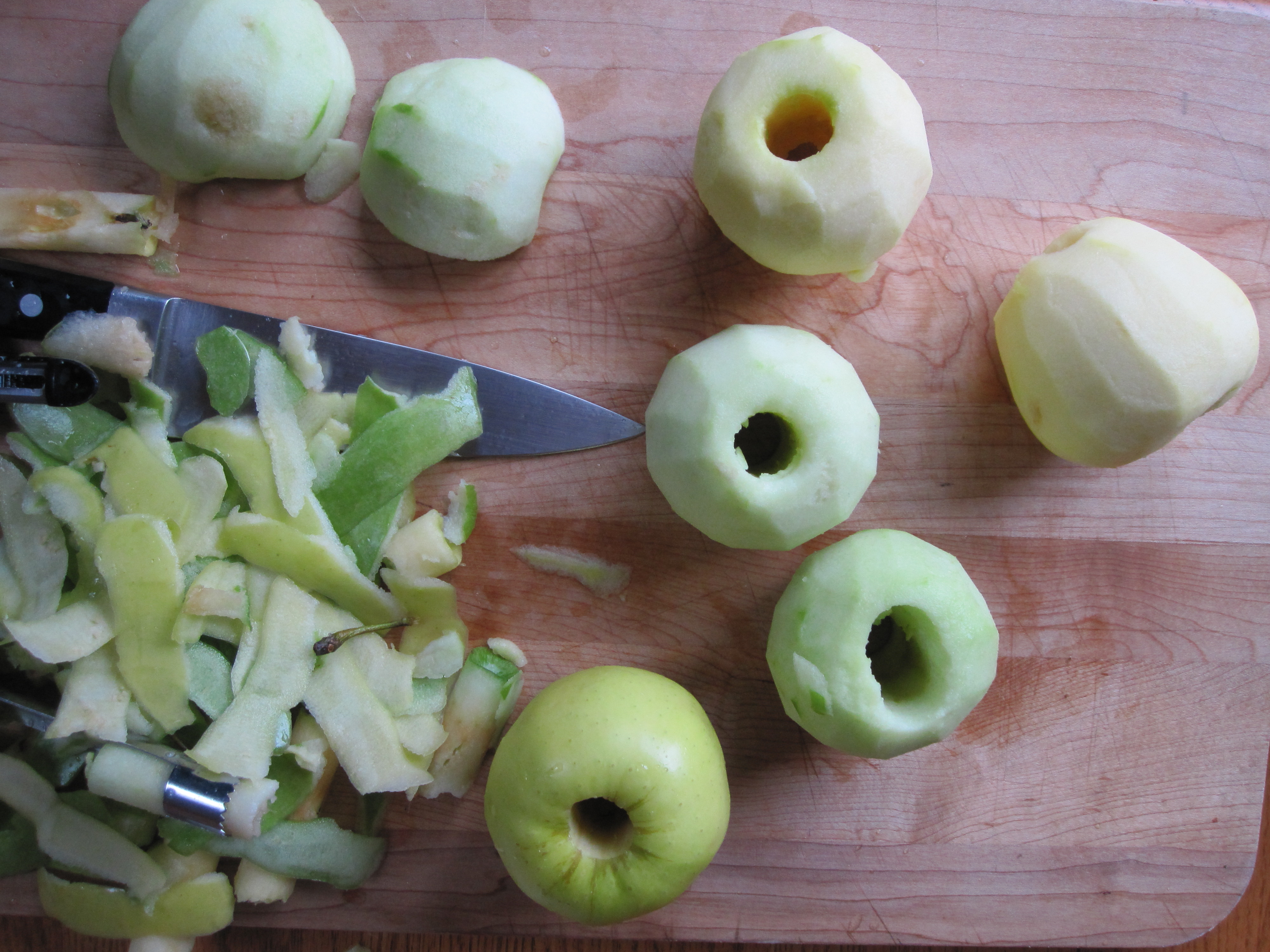 Not about to let a little thing like red under-ripe blackberries get us down, we assigned ourselves roles for our Blackberry Team. I picked the berries, my little man dumped the small containers into the bigger ones, and my little lady dragged the wagon up and down the trail laughing hysterically. After an hour of hard work (and just a few scrapes), we cruised home with a half-gallon of berries. Just enough for a few smoothies and Apple Blackberry Cake. While we suffer a shortage of ripe blackberries, we have boxes and boxes of Gravenstein apples from my parents’ trees.
