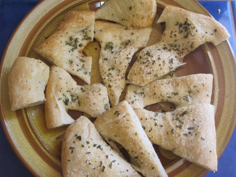 Though I have topped this bread many ways, my favorite remains brushing it with a garlic infused olive oil, sprinkling it with fresh herbs, and scattering coarse salt over the top. The outside becomes crunchy and brown, but the inside stays chewy and moist. The garlic flavor permeates the whole flatbread and the salt provides a crunch. It was a great accompaniment to our Huevos Diablos con Chorizo the other morning. Topping it with thinnly sliced apples is a close second, for a sweet version that is suitable for both brunch or dessert, though I would sweeten it up a bit more if serving it for dessert.