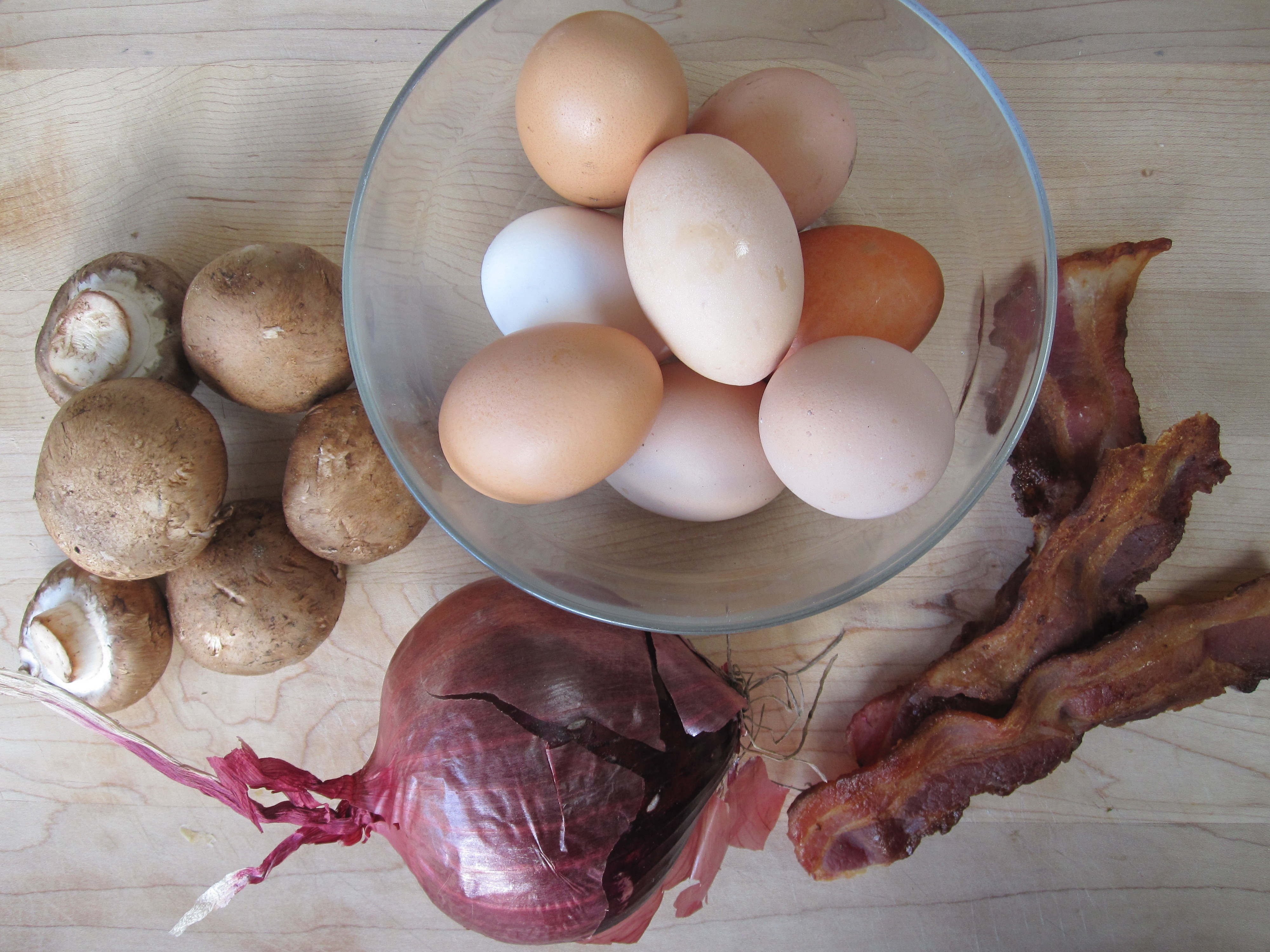 You can make a strata with almost anything. The eggs and bread are standard, but the vegetables, cheese, or meat that you add are completely up to you. Bacon Breakfast Strata happens to be one of my favorite combinations. Brown off the bacon, saute the onion and mushrooms, then mix everything up with a pile of bread and cheese and pour egg and milk over the top. It is easy. The bread absorbs the egg and milk overnight and puffs up in the oven. The interior texture is light and almost creamy, while the top browns and creates a cheesy crunch. It is delightful.