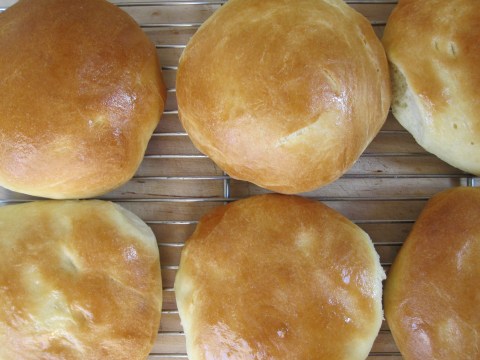 After we picked up a meat grinder attachment for our Kitchenaide, we discovered the magic of burgers made with freshly ground meat. This burger includes not only beef chuck roast, but also a very special not-so-secret ingredient, bacon! This was a perfect use for some bacon ends we had from our piggy in the freezer. Using a ration of 4 parts beef to 1 part bacon, I ground the two meats with the course grinding plate. After lightly tossing them to mix, I loosely formed them into patties. I pressed the meat just enough so they would hold together on the grill, but so there were still some small air spaces between the meat pieces. This gives a place for the juices and fat to collect (did I mention this is not a low-fat meal). Grilled over medium high and plopped on a fresh toasted bun, these burgers taste amazing. The bacon flavor is strong enough to make itself known, without being overpowering. The best part is that unlike a burger topped with slices of bacon, the bacon does not slide out of the bun as you try to bite through it. The flavors of the beef and bacon are perfectly blended. And then there is the bun…