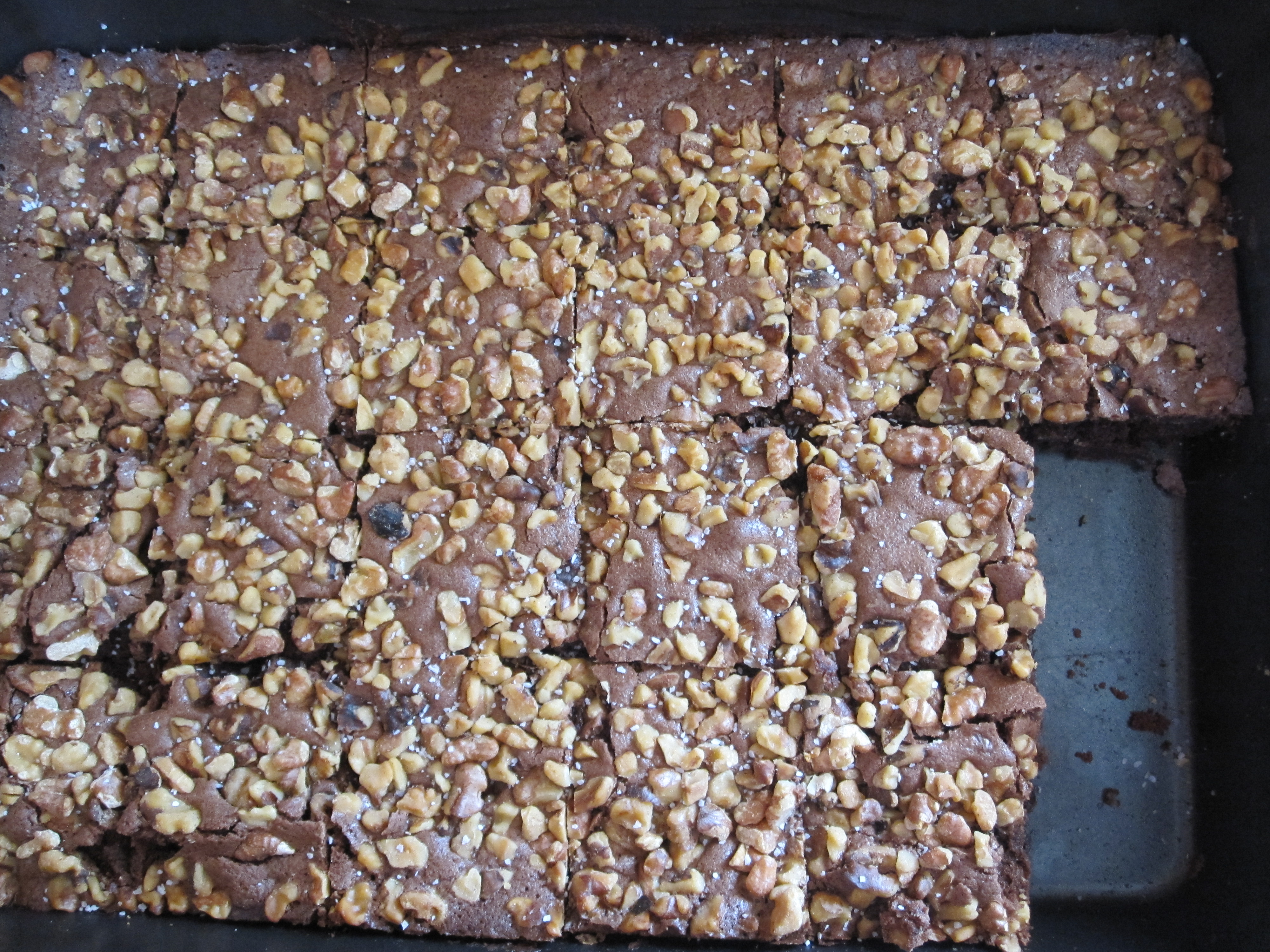 I adapted a recipe from Martha Stewart Living Desserts. Her original recipe is excellent. In fact it is so good that I have not been able to bring myself to try a different recipe since I discovered hers years ago. Martha’s recipe calls for baker’s chocolate but, I swapped that out for unsweetened ground cocoa because that is what I prefer to have on hand. She also calls for a half cup of chocolate chips, which are a nice addition, but I feel they detract a bit from the phenomenal texture and taste of the brownie itself. I left them out. Taking a tip from Cook’s Illustrated, the walnuts are sprinkled on top of the brownie instead of mixed in the batter. This prevents the top from cracking when you slice the brownies. It also makes it clear that to anyone with allergies that the brownies contain nuts. As a finishing touch, I sprinkle coarse sea salt over the top of the warm brownies. This adds a nice salty contrasting crunch as well as gives a little sparkle to the brownies.