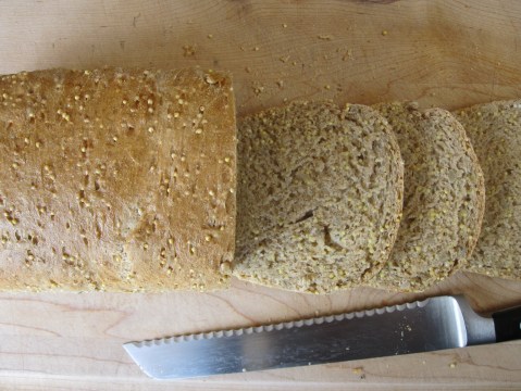I first fell in love with Sunflower Millet Bread when working at a natural food store in high school. This recipe is from The Greens Cookbook. Though it is almost completely based on whole wheat flour, it has a very open, light texture. The bread slices and toasts very well. I used the first loaf for egg sandwiches, then sliced and froze the second for breakfast toast in the coming weeks.