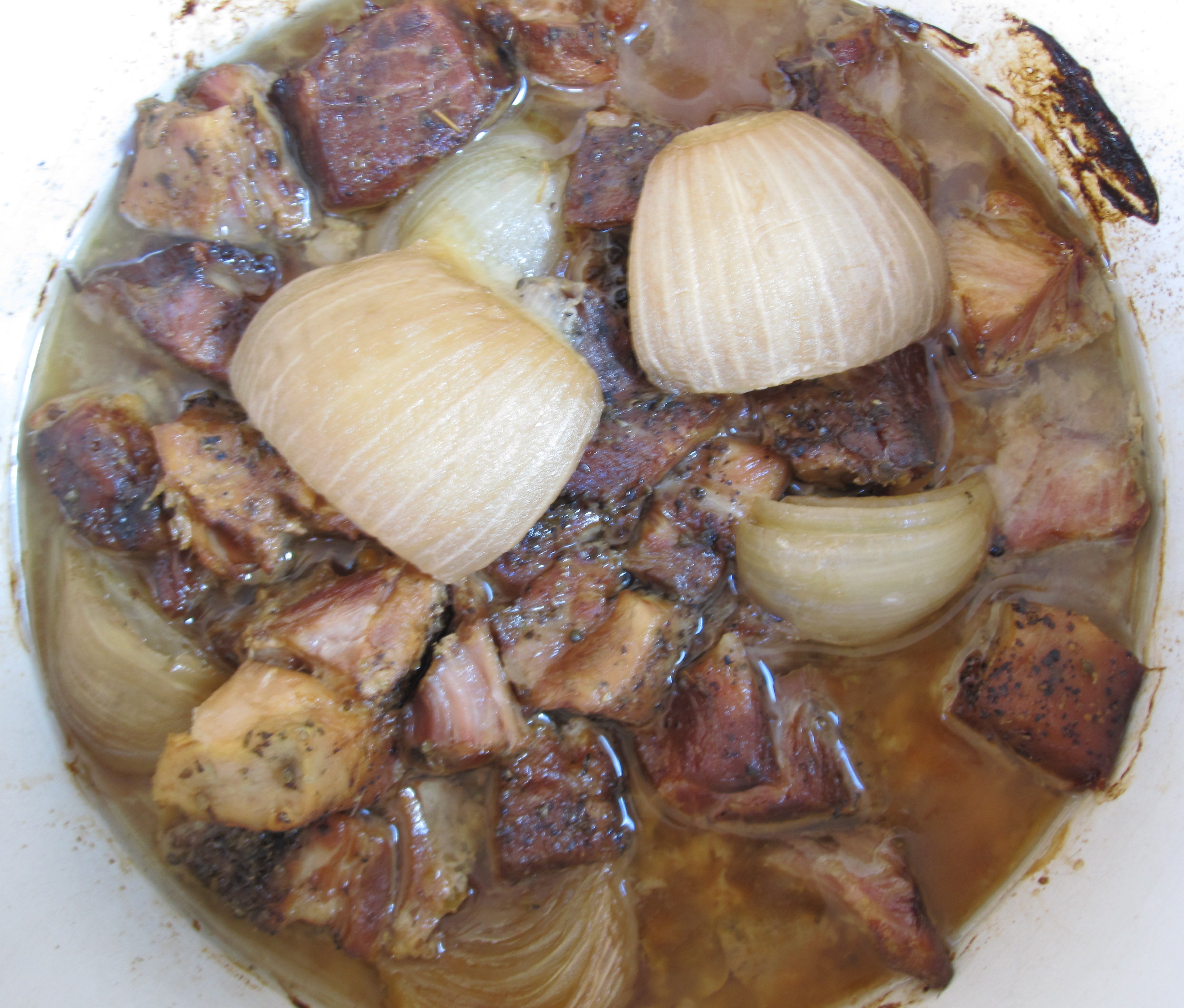 Toss the meat with the seasonings and place in the slow cooker. Toss onion quarters on top. Cover pot and cook on low for 6 hours.