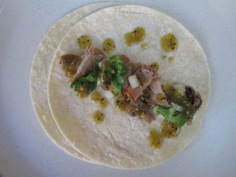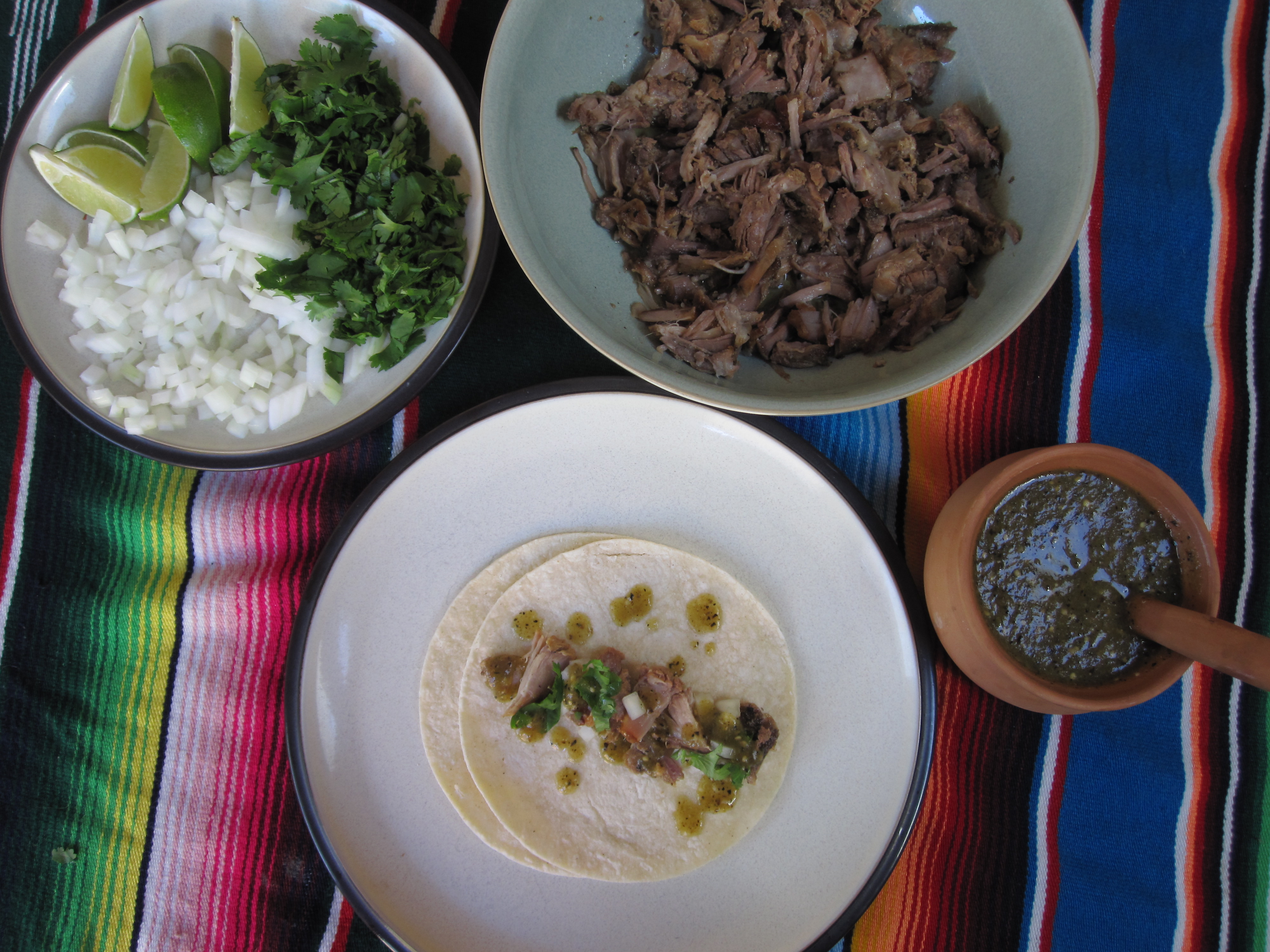 Discard onion. Remove meat with a slotted spoon and shred with your fingers. Serve warm with warm tortillas, minced onion, cilantro, and Grilled Tomatillo Salsa.