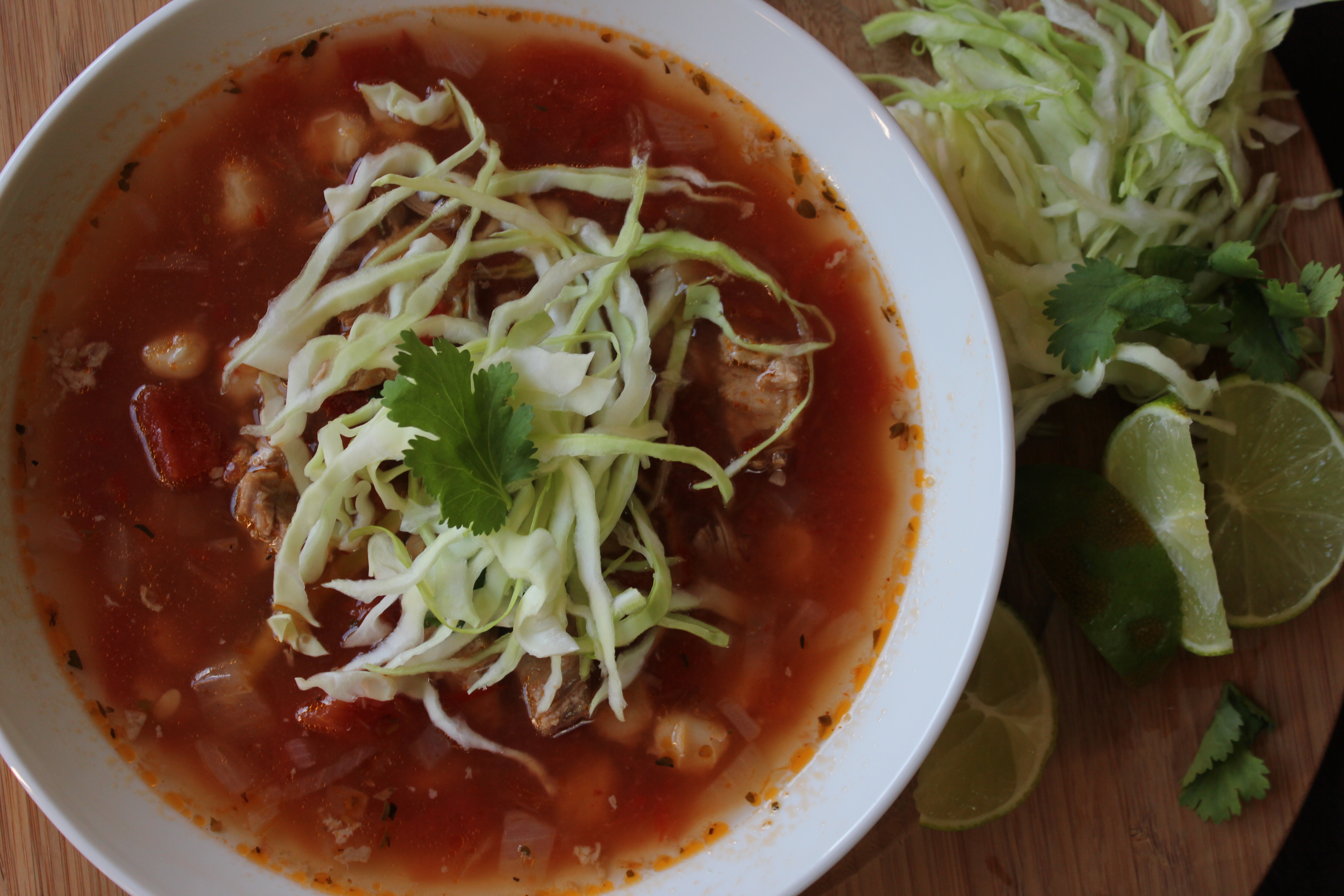 This is an all day soup, but do not let that discourage you! Just because this soup cooks all day does not mean that you are cooking all day. Plus, a pot simmering on the stove gives us a fabulous excuse to stay in on these cold winter days and spend the day in our slippers. The soup begins with a pork shoulder rubbed in Chile powder, salt, and pepper, then slowly braised until the meat is falling from the bone. The chunks of pork are added to a base of sauteed onion and garlic, dried chiles, and chicken broth. These ingredients are simmered together with tomatoes and hominy for as long as you can spare. Upon serving, the soup is topped with shredded cabbage, cilantro, serrano peppers, and minced onion. The combination of hot soup studded with chunks of pork and hominy, cold raw crunchy veggies, and tangy fresh lime juice squeezed over the top has won over my family. My little man gave it “100 thumbs up!”