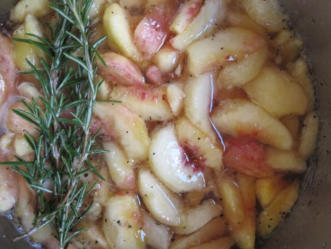Transfer peach mixture to a large pot. Bring to a boil over medium-high heat. Cook for 15 minutes, until mixture is syrupy. Lightly mash the mixture to break down peach slices, leave 1/3 of wedges intact. Discard rosemary sprigs (you can fish out the individual rosemary leaves if you want, but I leave some in for color and interest.)