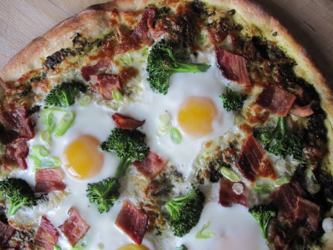 Breakfast Pizza earns its sincere place at the breakfast table because it boasts both eggs and bacon, quintessential breakfast foods. On the tossed dough round, pesto creates a base of flavor and color. The cheese is somewhat lightly scattered, to allow the egg to take center stage. Cook the bacon until crispy before chopping it and tossing it on the pie. The eggs are not cooked in advance, simply crack them on top. I used four which seemed to fit nicely on both the pizza and our plates (there are four of us). For those of you who do not equate broccoli with breakfast (like half of my family) feel free to leave it off. I like any chance to toss veggies into every meal and our garden is overflowing with broccoli right now. Like any pizza there are a million variations. Pesto could easily be replaced with roasted garlic sauce, tomato-based pizza sauce, or simply a brush of olive oil. Change out sausage for the bacon or leave them off altogether for a vegetarian meal. Not into broccoli? Try asparagus in the spring or tomatoes in the summer. Nothing even says you have to eat this for breakfast, it would be a great lunch or dinner as well.