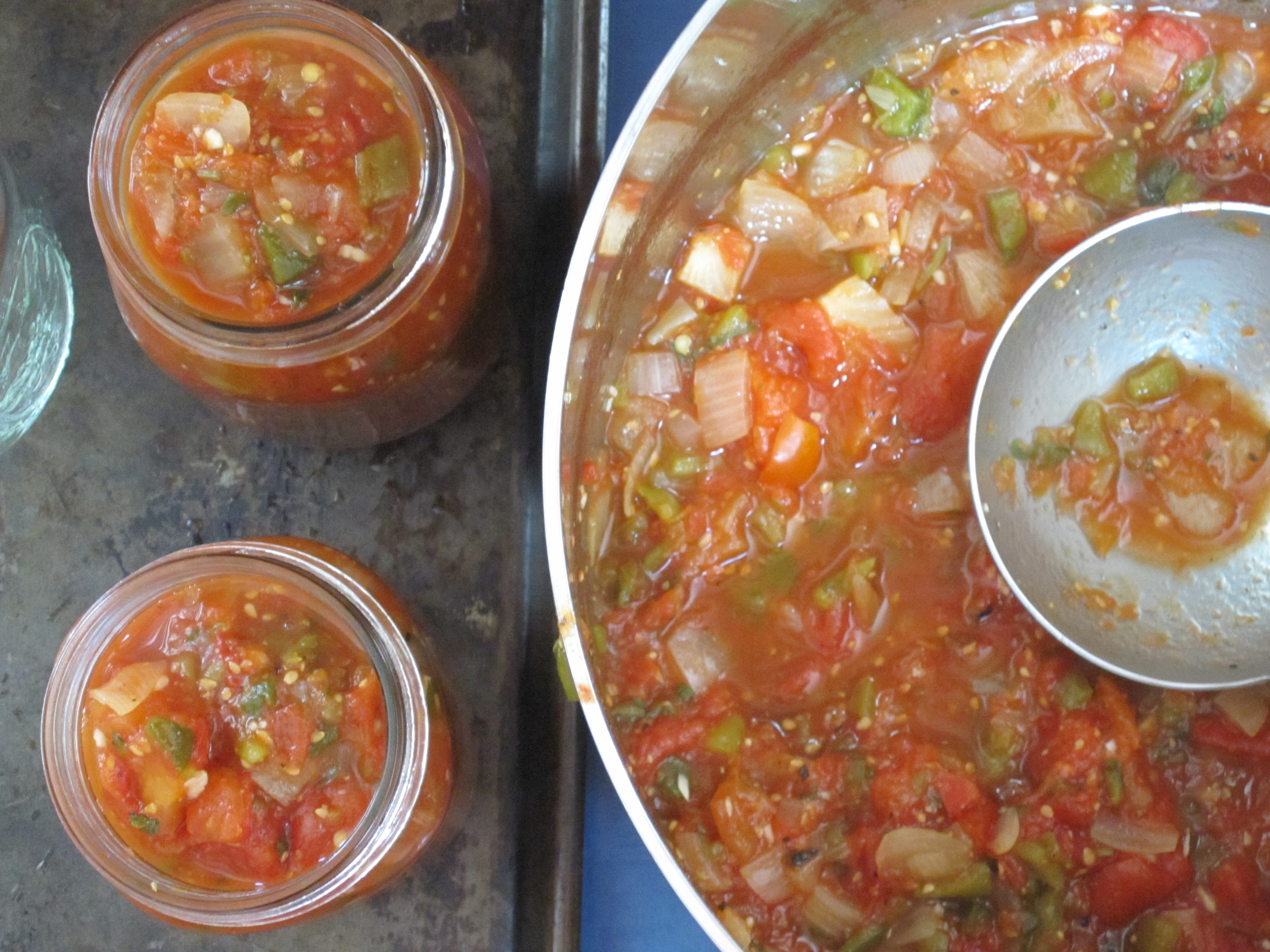Starting early in the morning, I prepared a “ketchup” that we all agreed is delicious, but not ketchup. Luckily, instead of an outright rejection, my son suggested we rename it and came up with “Rojo Sauce”. Perfect. Another lug of tomatoes went into a basic tomato sauce, and the last load into Chunky Garden Salsa.