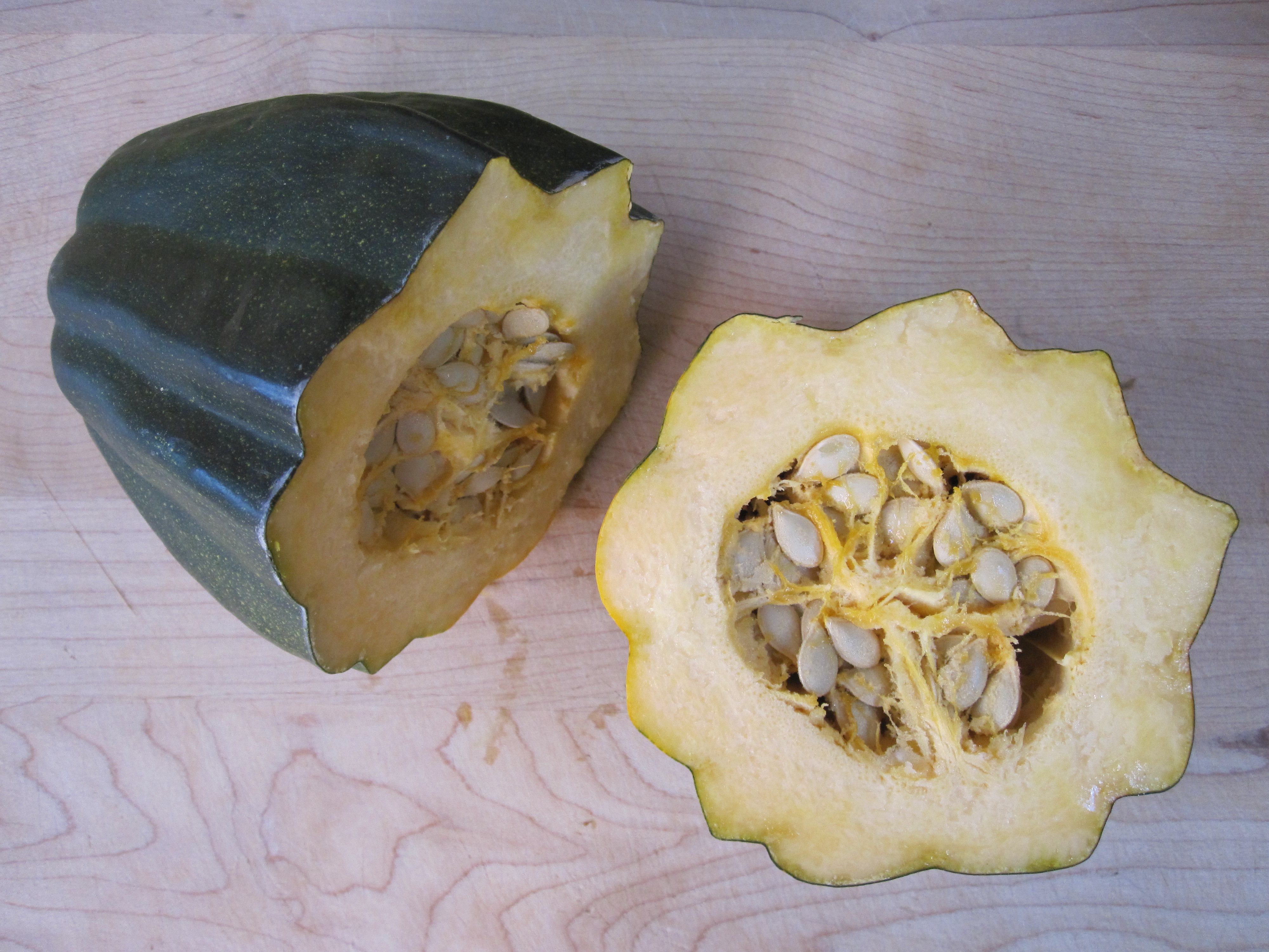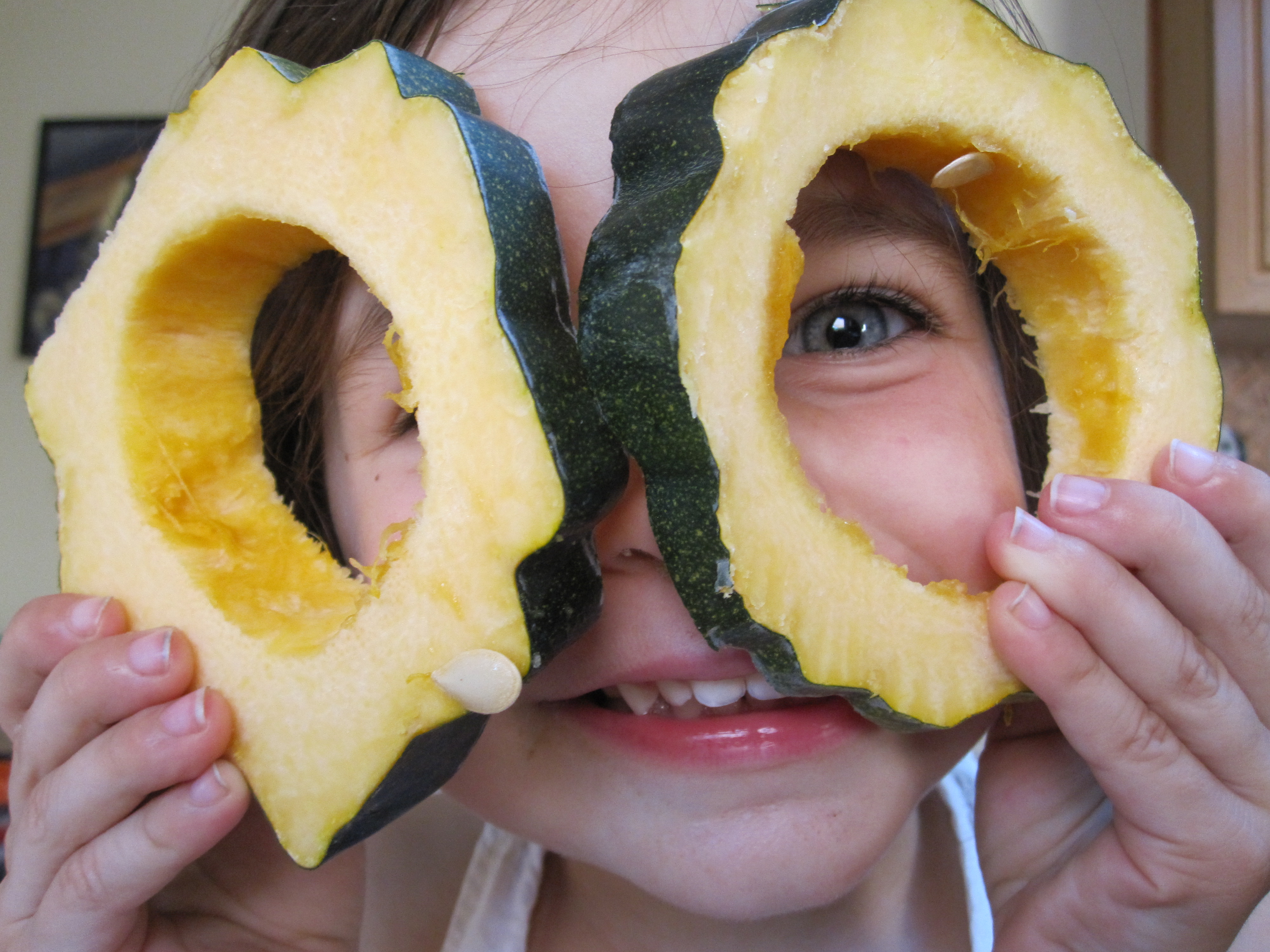 Take care in slicing the squash, as that is as good a way as any to loose a finger. It helps to take a small slice off of one side, then place the cut side down. That will give the squash some stability as you hack into it. Scoop out the membrane and seeds and they are ready to steam. Do not forget to try on some squash glasses for size! Note: at least with my kids, they are more likely to eat the veggies if they have a hand in making/playing with them! (For more ideas on getting kids to eat their veggies check out this post.)