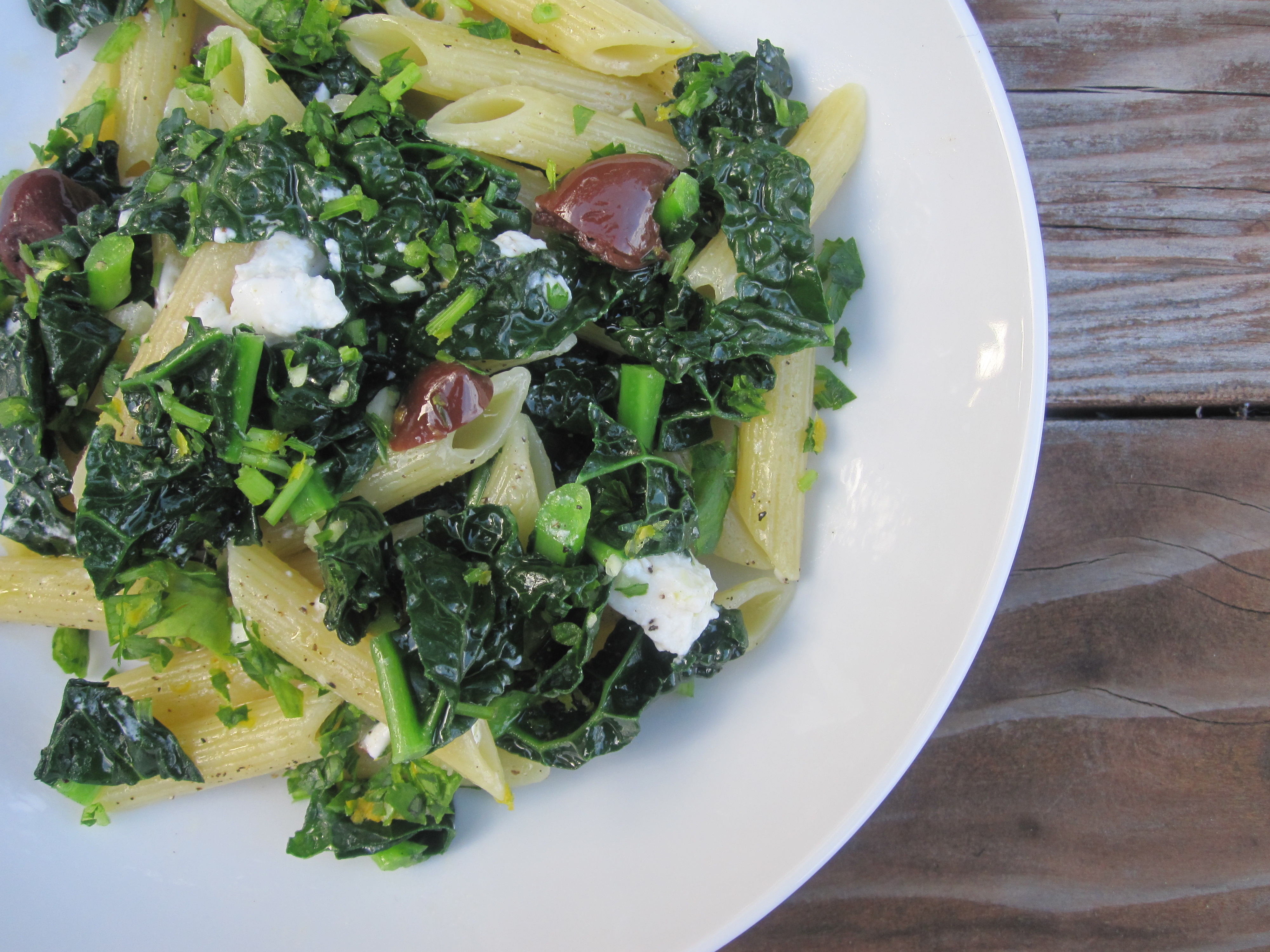 Penne with Kale, Feta and Olives is no ho-hum vegetarian pasta dish. Kale itself is a flavorful green, but combining it with the briny olives and pungent feta make this dish a powerhouse. Parsley, garlic, and lemon zest scatter over the top adding even more dimension to this simple dish. The recipe entered our rotation a few years ago when it was featured in Bon Appetit. Any kind of kale works here, but I prefer Dinosaur or Lacinto Kale. I reduced the oil recommended in the original recipe. Feel free to drizzle olive oil over the top if you so desire.